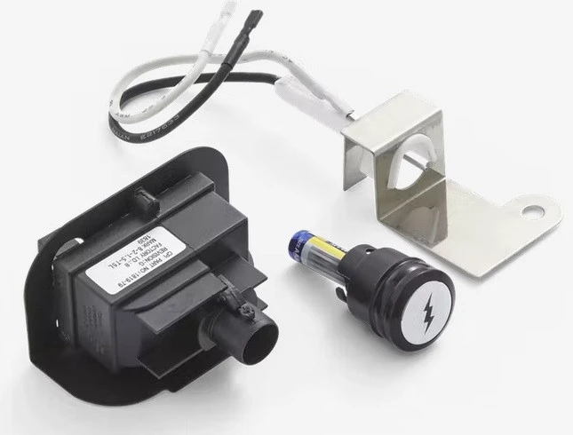 Kit includes ignition module, electrode, ignition button, battery, and instruction sheet.